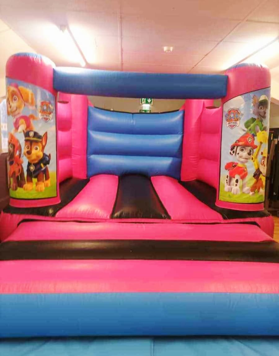 Book bouncy castle hire Pink and Blue Low Height Castle in Stoke on trent staffordshire cheshre and surrounding area's for safe, colourful indoor fun. This low-height castle fits rooms with limited vertical space. It's perfect for homes, halls, and community centres. Fast setup. Soft bounce. Big smiles.